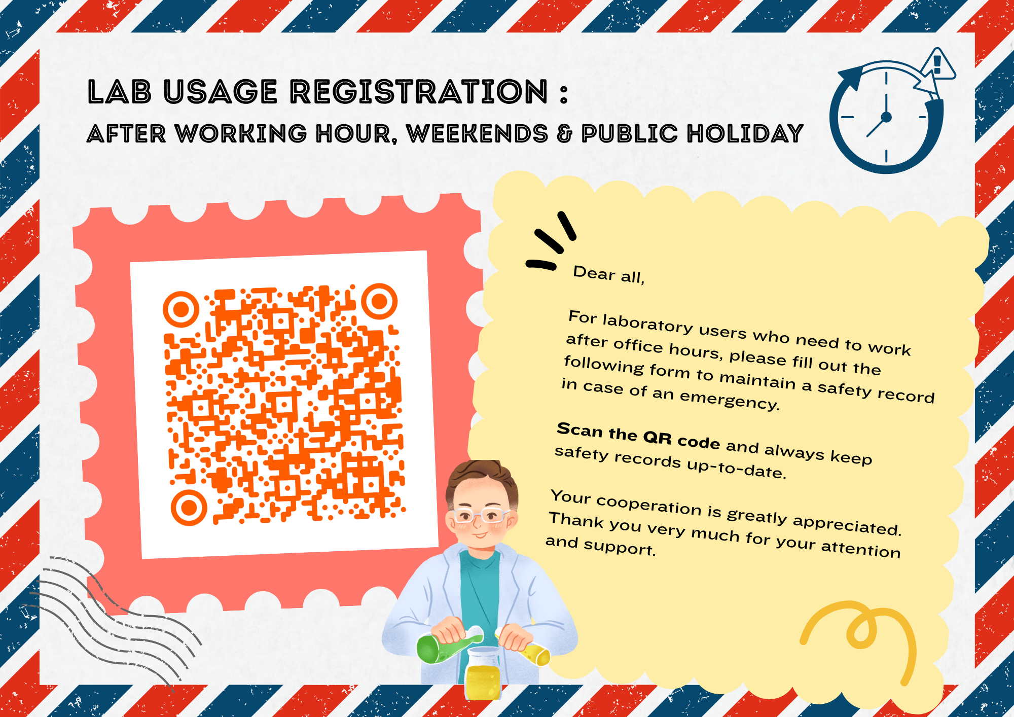 For laboratory users (strictly for BRI staffs and students ONLY) who need to work after office hours, please fill out the following form to maintain a safety record in case of an emergency.